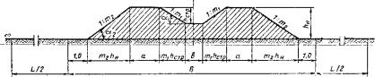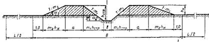 для каналов, проходящих в выемке (рис. 1а) — по табл. 1, в полувыемке (рис. 1б) — по табл. 2, в полунасыпи (рис. 1б) — по табл. 3 и в насыпи (рис. 1в) — по табл. 4.