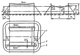 Рис. 4. Молниезащита здания I категории отдельно стоящим тросовым молниеотводом (& = 300 Ом×м, S0£4 м, Sз£6 м, Sв1³3,5 м): 1 - трос; 2 - граница зоны защиты; 3 - ввод подземного трубопровода; 4 - граница распространения взрывоопасной концентрации; 5 - соединения арматуры, выполняемые сваркой; 6 - железобетонный фундамент; 7 - закладные элементы для присоединения оборудования; 8 - заземляющий проводник из стали 4×40 мм; 9 - заземлители - железобетонные подножники; 10 - граница зоны защиты на отметке 10,8 м