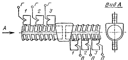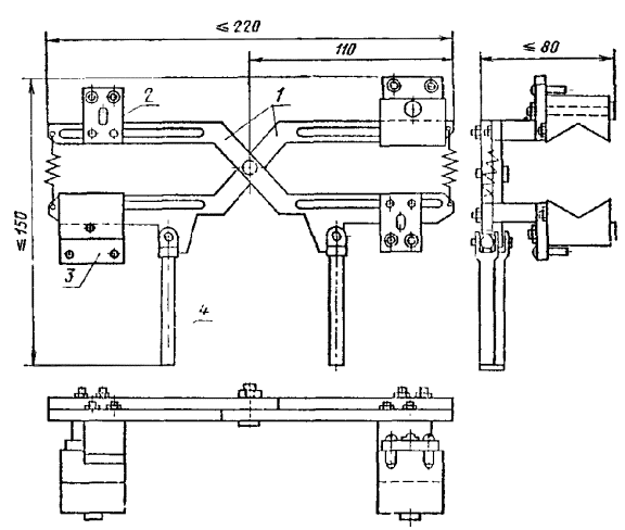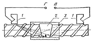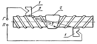 метка, соответствующая точке выхода луча (ГОСТ 1782-76); Г - вывод к генератору ультразвуковых колебаний; П - вывод к приемнику Черт. 1 зеркально-теневым - стыковых соединений стержней, выполненных на стальных скобах-накладках или подкладках (черт. 2); эхо-импульсным - тавровых соединений стержней с пластинами, выполненных под флюсом (черт. 3); фланговые швы в стыковых соединениях, выполненных на стальных скобах-накладках (например, ванно-шовная сварка), ультразвуковому контролю не подлежат. 1 – наклонные искатели; 2 - соединение; 3 - скоба-накладка; Г – вывод к генеральному ультразвуковых колебаний; П - вывод к приемнику Черт. 2 1 - раздельно совмещенные искатели; 2 - сварное соединение; 3 - стержень; 4 -