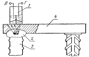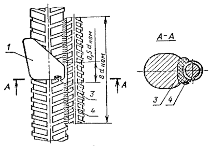 1 - сварное соединение; 2 - стальная скоба; 3 - накладка; 4 - протяженные сварные швы; 5 -