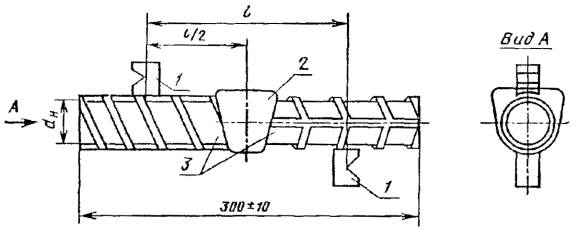 5. Испытательный образец (черт. 4, 5) для настройки чувствительности дефектоскопа должен быть идентичен по диаметрам свариваемых стержней, классам стали, конструктивным элементам соединений, способам сварки и сварочным материалам контролируемому соединению, а также удовлетворять показателям прочности не ниже С2 по ГОСТ 10922-75. Таблица 1