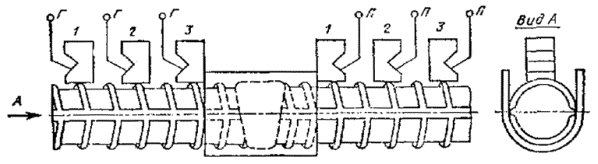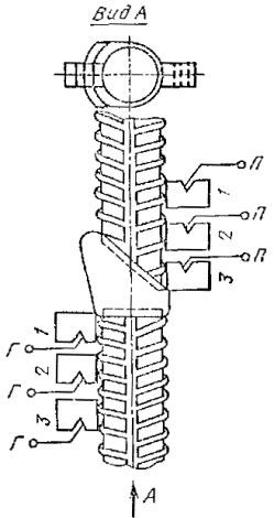 скоба-накладка (подкладка) Черт. 5 1 – искатель; 2 - пластина закладной детали; 3 - вывод к генератору ультразвуковых колебаний; П - вывод к приемнику. Черт. 6 3.3. Перед проведением контроля, непосредственно на рабочем месте должна быть настроена чувствительность дефектоскопа. Для настройки чувствительности дефектоскопа при контроле стыковых соединений стержней следует: установить искатели на испытательном образце согласно черт. 4 или 5 (в зависимости от способа сварки); установить максимальную величину амплитуды опорного сигнала А0 и вывести его на середину экрана по горизонтальной развертке дефектоскопа; подвести к импульсу передний фронт строб-импульса; замерить величину амплитуды опорного сигнала и полученное значение записать в журнал (протокол) контроля (см. приложение 2). При контроле тавровых соединений стержней с пластинами: установить искатели согласно черт. 6 на пластине контролируемого соединения; установить величину амплитуды опорного сигнала для соответствующего диаметра стержня, равную значению, указанному в табл. 1, и полученное значение записать в журнал контроля. 3.4. Для обеспечения акустического контакта между искателем стержнями стыкового соединения или пластиной в местах установки искателем на стержень (пластину) непосредственно перед контролем следует нанести смазку. При контроле стыковых соединении стержней следует применять смазку консистенцией, обеспечивающей заполнение впадин профиля, например, солидол, а при контроле закладных деталей следует использовать легко смывающуюся контактную смазку (см. приложение 3). 4. ПРОВЕДЕНИЕ КОНТРОЛЯ4.1. В период поиска дефектов в стыковых соединениях стержней уровень чувствительности дефектоскопа следует повысить на величину 15 дБ по сравнению с величиной опорного сигнала, полученного на испытательном образце. Замер максимальной амплитуды сигналов на контролируемом сварном соединении необходимо проводить в трех точках по схеме, указанной на черт. 7 и черт. 8, перемещая систему искателей в одной плоскости. В крайних положениях (позиции 1-1 и 3-3) один из искателей следует помещать вплотную к сварному шву или скобе-накладке (см. черт. 8). В среднем положении (позиция 2-2) искатели следует располагать симметрично сварному шву. Результаты трех замеров амплитуды сигналов (A1, А2, А3) следует занести в журнал контроля. 4.2. В период поиска дефектов в тавровых соединениях уровень чувствительности дефектоскопа следует увеличить на 6 дБ по сравнению со значениями разности амплитуд, указанными в табл. 7. При обнаружении дефекта необходимо понизить уровень чувствительности дефектоскопа до первоначального уровня. При осуществлении контроля искатель необходимо расположить на пластине, поместив его внутри ограничительного кольца механического шаблона-приспособления и производить перемещение искателя на пластине в пределах ограничительного кольца, фиксируя величину максимальной амплитуды. 5. ПРАВИЛА ПРИЕМКИ5.1. Качество стыковых соединений стержней и товарных соединений закладных деталей должно быть проверено органами контроля строительно-монтажных объединений, трестов и приравненных к ним организаций. соединения стержней, ВЫПОЛНЕННЫЕ В ИНВЕНТАРНЫХ ФОРМАХ Горизонтальное соединение