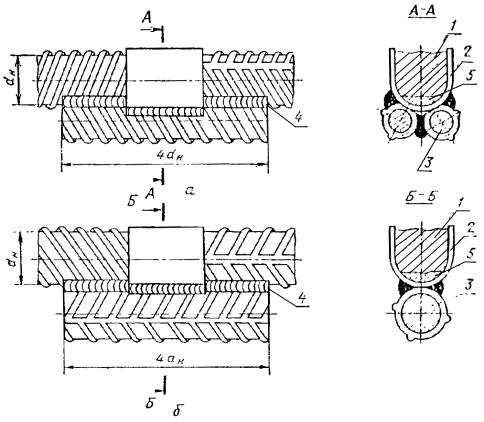 3. Усиление горизонтальных соединений стержней, выполненных в инвентарных формах, следует осуществлять аналогично приведенному на черт. 2а или черт. 2б, а соединении вертикальных стержней на стальных скобах аналогично приведенному на черт. 1, обеспечив плотное прилегание накладок.