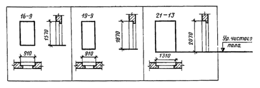 асбестового картона толщиной 5 мм по ГОСТ 2850. ГАБАРИТНЫЕ РАЗМЕРЫ ДВЕРЕЙ Примечания: 1. Схемы дверей изображены со стороны фасада. 2. Цифры над схемами дверей обозначают размеры проемов в дециметрах. 3. Размеры в скобках даны для дверей 21-15А, 21-19, 24-15A и 24-19 с качающимися полотнами. 4. Двери 21-9 и 21-13A предусмотрены для одноэтажных зданий и мусороприемных помещений. Черт. 1 КОНСТРУКЦИЯ, ФОРМА И
