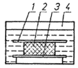 1 — сетчатый пригруз; 2 — образец; 3 — сетчатая подставка; 4 — ванна Рисунок 4 — Ванна с образцом, полностью погруженным в воду 10.3.2 Порядок подготовки к испытанию Для испытания из изделия вырезают образец в форме прямоугольного параллелепипеда длиной и шириной (100 ± 2) мм и толщиной, равной толщине изделия. Из органических ячеистых изделий вырезают образец размером [(50 х 50 х 50) ± 1] мм. При толщине изделий меньше 50 мм высоту образца принимают равной толщине изделия. Образцы высушивают до постоянной массы в соответствии с разделом 3 и охлаждают в эксикаторе над хлористым кальцием. 10.3.3 Порядок проведения испытания В ванну 4 (рисунок 4) на сетчатую подставку 3 помещают образец 2 и фиксируют его положение сетчатым пригрузом 7. Затем заливают в ванну воду температурой (22 ± 5) °С так, чтобы уровень воды был выше пригруза на 20 — 40 мм. Через 24 ч после залива воды образец переносят на подставку и через 30 с взвешивают на сухом поддоне. Массу воды, вытекшей из образца во время взвешивания в поддон, включают в массу насыщенного водой образца. Образцы из органических ячеистых изделий через 24 ч после залива воды вынимают, протирают фильтровальной бумагой и взвешивают. 10.4 Метод определения водопоглощения при частичном погружении образца в воду 10.4.1 Сущность метода заключается в измерении массы воды, впитанной образцом сухого материала, частично погруженным в воду, в течение заданного времени. 10.4.2 Для испытания вырезают образец по форме прямоугольного параллелепипеда длиной и шириной (100 ± 2) мм и толщиной (30 ± 2) мм. Если толщина изделия больше 30 мм, то излишек срезают с одной стороны. Образец высушивают до постоянной массы, затем охлаждают в эксикаторе над хлористым кальцием и взвешивают. 10.4.3 В ванну 3 (рисунок 5) на сетчатую подставку 2 помещают несрезанной плоскостью образец 1.