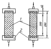 СТЕКЛОВАТНЫХ ПЛИТ В СООТВЕТСТВИИ С ИСО 8145 E.1 Метод распространяется на теплоизоляционные плиты из минеральной и стеклянной ваты на синтетическом связующем. Е.2 Общие требования — в соответствии с разделом 3. Е.3 Сущность метода заключается в измерении растягивающего усилия, вызывающего разрушение образца при заданных условиях испытания. Е.4 Аппаратура, инструменты, материалы Машина разрывная, обеспечивающая растяжение образца со скоростью 9 — 11 мм/мин и позволяющая измерить значение разрушающего усилия с погрешностью не более 1 %. Линейка металлическая по ГОСТ 427. Прибор для измерения толщины (рисунок А4). Мастика битумная по ГОСТ 2889. Две плоских жестких пластины длиной и шириной (200 ± 1) мм. Е.5 Предел допускаемой погрешности измерения линейкой и прибором для измерения толщины — ± 0,5 мм. Е.6 Из плиты вырезают образец в форме параллелепипеда длиной и шириной (200 ± 1) мм и толщиной, равной толщине плиты. Образец вырезают в произвольном месте плиты, но не ближе 50 мм от ее края. Е.7 При помощи битумной мастики приклеивают к образцу две жесткие плоские пластины (рисунок E1). При приклеивании прикладывают давление, величина которого не больше, чем давление, достаточное для хорошего контакта поверхностей пластин и образца. Образец помещают в разрывную машину. Прикладывают к образцу растягивающее усилие при скорости движения активного захвата 9 — 11 мм/мин. Разрушающей считают наибольшую нагрузку, отмеченную при испытании образца в момент его разрушения. Если разрушение образца произошло по приклеивающему слою, то результаты испытания этого образца аннулируют. Е.8 Предел