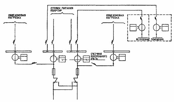 РИС. 6. СХЕМА УЧЕТА ЭЛЕКТРОЭНЕРГИИ В ЖИЛЫХ ДОМАХ ДО 9 ЭТАЖЕЙ ВКЛЮЧИТЕЛЬНО С УСТАНОВКОЙ СЧЕТЧИКОВ КОНТРОЛЬНОГО УЧЕТА НА ЛИНИЯХ ПИТАНИЯ КВАРТИР