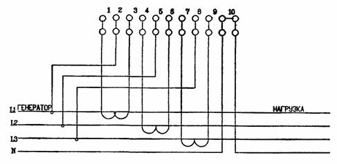 Рис. 10. ВКЛЮЧЕНИЕ СЧЕТЧИКА АКТИВНОЙ ЭНЕРГИИ ЧЕРЕЗ ТРАНСФОРМАТОРЫ ТОКА В СЕТЬ 0,4 кB