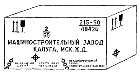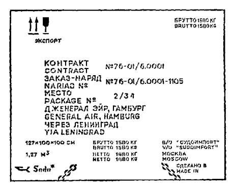 1). 7.2 Основные надписи: номер контракта и (или) номер заказа иностранного покупателя; номер заказа-наряда; номер грузового места - указывается дробью, в числителе - порядковый номер места в партии; в знаменателе - количество мест в партии; полное наименование или условное обозначение иностранного грузополучателя; наименование пункта назначения с указанием станции или порта перегрузки; страна назначения груза *; станция и дорога назначения груза *; товарные знаки и марки грузоотправителя *. 7.3 Дополнительные надписи: наименование экспортирующей организации - полное или условное; пункт отправления груза; станция и дорога отправления. 7.4 Информационные надписи: габаритные размеры грузового места в сантиметрах; массы нетто и брутто в килограммах; объем грузового места в кубических метрах; надписи «Экспорт», «Страна-изготовитель и (или) поставщик». Не указывают габаритные размеры и объем грузового места при длине, ширине или диаметре до 1 м. 7.4.1 По
