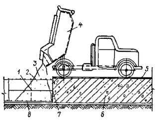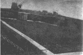 На песчаный подстилающий слой укладывают несущее основание из тощего укатываемого или монолитного бетона, укрепленных каменных материалов или используют железобетонные плиты временно построенных дорог |