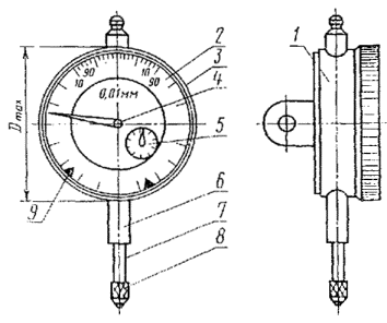 измерительный стержень; 8 - измерительный наконечник; 9- указатель ноля