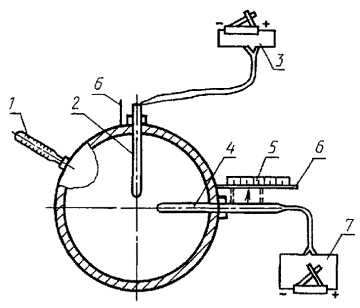 приборов в газоходе 1 - термометр; 2, 4 - контрольная и рабочая напорные трубки, 3, 7 - микроманометры для измерений динамического давления в контрольной и рабочих точках; 5 - линейка; 6-стальной пруток Черт. 4 Входные отверстия для измерений внутри газохода