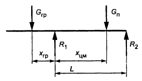 расстояние от центра массы груза до передней оси; R1, R2 - реакции от
