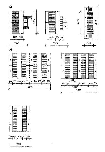Рис. 25 Функциональные зоны в раздевальных а - ясельных групп детей; б - в группах детей 3-6 (7) лет 1 - шкаф для верхней одежды детей; 2 - пеленальный стол; 3 - скамья для переодевания детская
