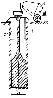3.37. При бетонировании скважин в маловлажных глинистых грунтах с устойчивыми стенками можно использовать метод свободного сброса бетонной смеси. В этом случае глубина скважины не должна превышать 12-14 м. Бетонную смесь литой консистенции с подвижностью 16-18 см ОК подают непосредственно из автобетоносмесителя в приемную воронку, которую устанавливают на обсадной патрубок длиной 2,5-3 м (рис.11).