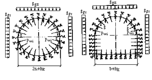 напор подземных вод; pwi - расчетное внутреннее давление воды; pwin - нормативное внутреннее давление воды. Характеристика материалов Ek - модуль упругости обделки; Eb - модуль упругости бетона; Es - модуль упругости арматуры; Rst - расчетное сопротивление арматуры растяжению; Ryn - нормативное сопротивление по пределу текучести