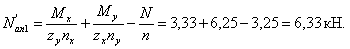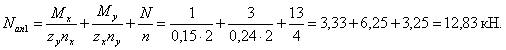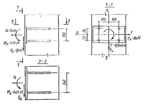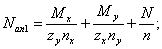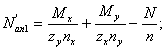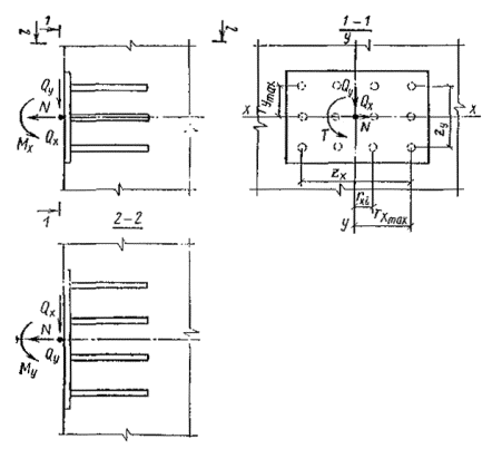 - соответственно изгибающие моменты относительно x и y; Т - крутящий момент; Nan - наибольшее растягивающее усилие в одном ряду нормальных анкеров; Nan1 -