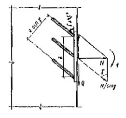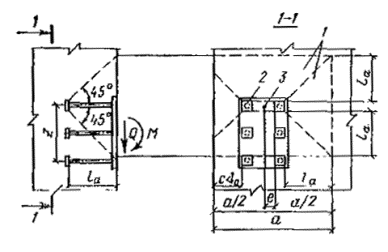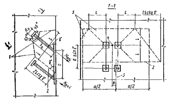 наибольшее растягивающее усилие в одном нормальном анкере; Qan - сдвигающее усилие, приходящееся на один ряд нормальных анкеров; Qan1 - наибольшее сдвигающее усилие, приходящееся на один