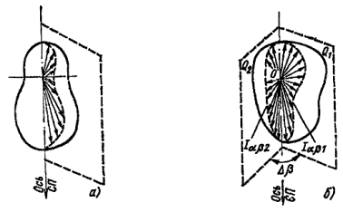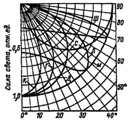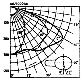 перпендикулярной его оси, и кривые силы света в продольной и поперечной