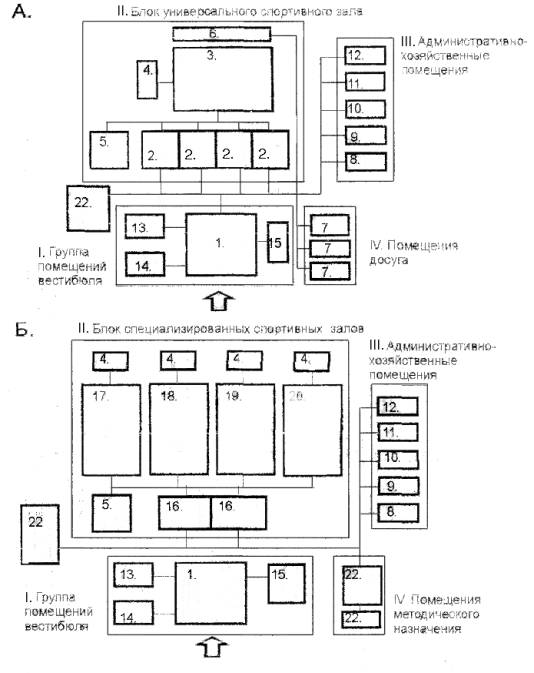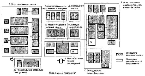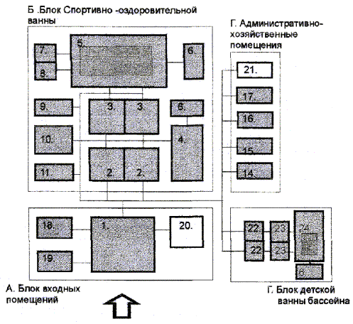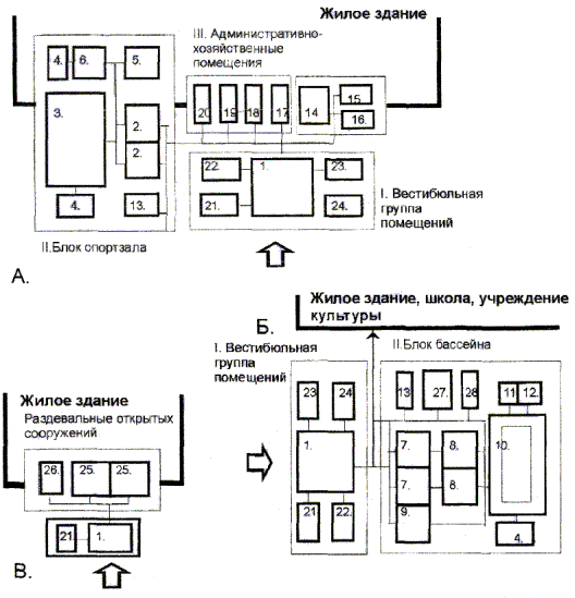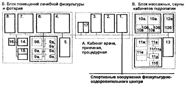 Схемы функциональных блоков физкультурно-оздоровительного центра при их