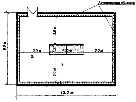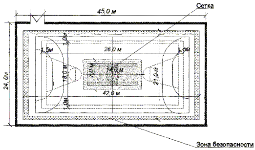 единоборствами в зале 24´15 м. Экспликация. 1. Стоп для игры в шоу-даун. 2. Зоны безопасности. Рис.