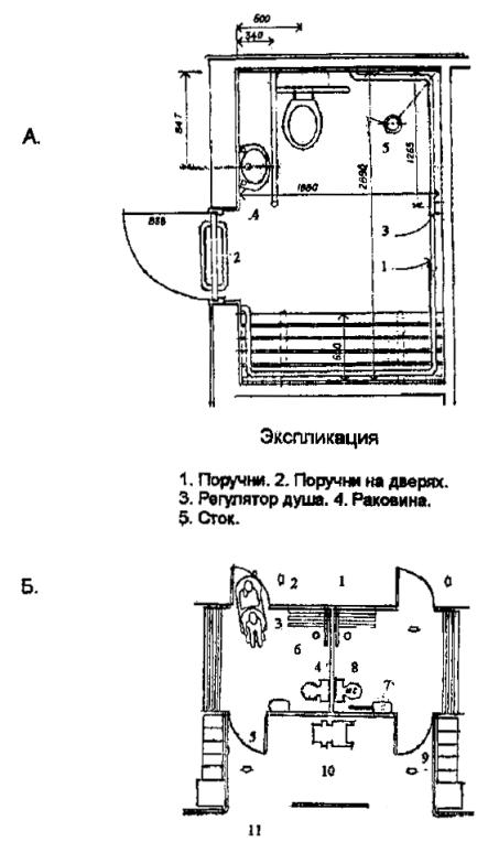 крючками для переодевания. 8. Туалет. 9. Душевая кабина. 10. Места установки аппаратов механотерапии.