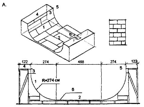 22. Габаритные схемы различных устройств для роллерспорта 1. Две четверть-трубы. 2. Плоское дно-соединение. 3. Вертикальные