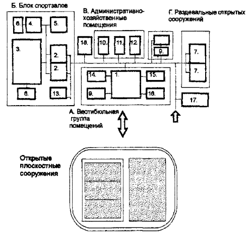 помещений 1. Вестибюль, гардероб. 2. Раздевальные, душевые залов. 3. Зал ОФП. 4. Зал хореографии 5. Тренажерный зал. 6. Инвентарная. 7. Раздевальные открытых плоскостных сооружений. 8. Холл-комната отдыха. 9. Медпункт. 10. Администрация. 11. Тренерская. 12. Бытовые, помещения. 13. Хозяйственная кладовая. 14. Туалет. 15. Буфет. 16. Пункт проката спортинвентаря. 17. Инвентарные и складские помещения открытых спортсооружений. 18. Технические помещения. Рис.