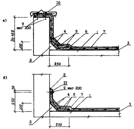 мастика; 9 - дюбели; 10 и 11 - металлические фасонные элементы. Рис. 2. Примыкание