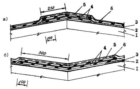 ендова (б) кровли. 1 - основание под кровлю; 2 - грунтовка; 3 - приклеивающая мастика