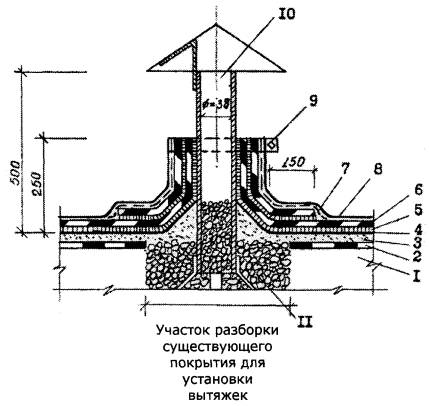 9. Устройство вытяжных патрубков. 1 - основание под кровлю; 2 - существующие слои кровли; 3 -