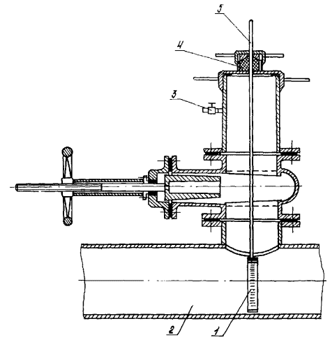 Рис. 16. Винт кассеты для установки контрольных образцов через задвижку. Материал - пруток БрКМц3-1т-кр-10 (ГОСТ 1628-78) Рис. 17. Шток кассеты для установки контрольных образцов через задвижку. Материал - Ст. 35 (ГОСТ 14959-79) Рис. 18. Схема установки контрольных образцов через задвижку: 1 - кассета с образцами; 2 -