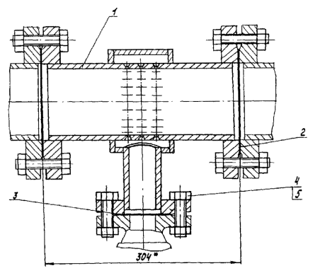 трубопровод; 3 - вентиль; 4 - сальник; 5 - шток Рис. 19. Распределительная головка для ввода ингибитора (сборочный чертеж): 1 - ввод [1]**, 2 - прокладка [2]; 3 - болт М20 х