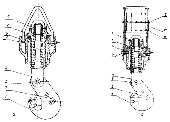 Рис. 1. Крюк (а) и крюкоблок (б): 1 - центральный рог; 2 - боковой