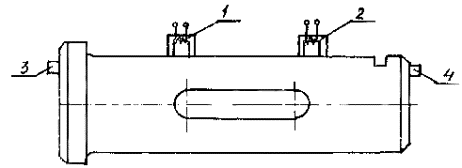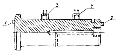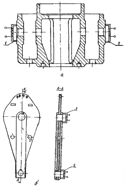 4 - ультразвуковой преобразователь Рис. 14. Ось блоков: 1, 2 - П-образный электромагнит Контроль оси блоков (шкивов) и бокового рога крюка