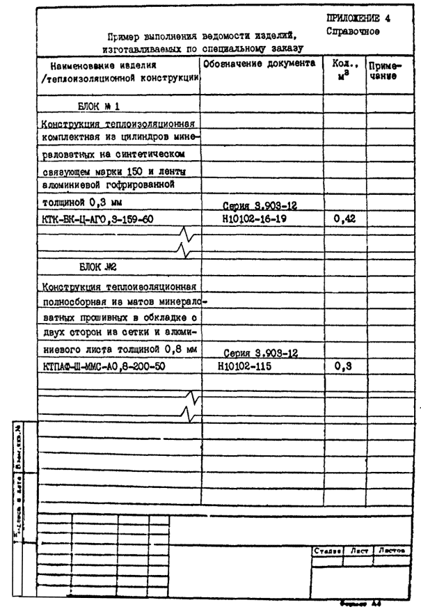 приведена в общих данных к основному комплекту рабочих чертежей. В графе «Примечание» должна быть приведена масса теплоизоляционных