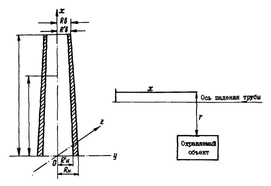 охраняемого объекта до участка трубы после падения, м; H - высота трубы, м;