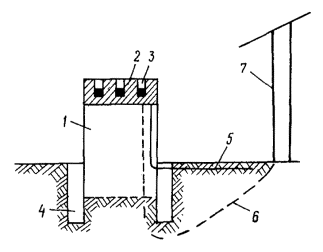 где h - глубина траншеи. Рис. 3. Схема окопки разрушаемого взрывом фундамента: 1 - фундамент; 2 - снимаемый взрывом