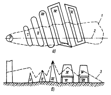 охраняемый объект. Рис. 4. Ситуация после взрыва трубы: а - план; б - профиль по оси ОА; 1 - контур