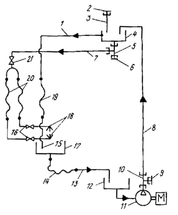 трубопроводу 7 через запорный вентиль 21, шланги 20 и запорные вентили 16