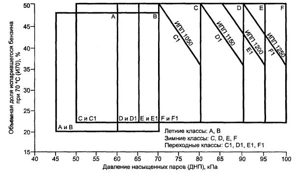 Требования к испаряемости Стандарт предусматривает производство 10 классов бензинов
