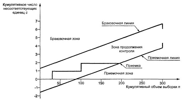 решение о приемке для этого объема выборки не допускается. Правила многоступенчатого контроля повторяют (в более расширенном виде) правила двухступенчатого контроля. Отличие их состоит в том, что в некоторых случаях символ # заменяет приемочное число. Это означает, что приемка для данного объема выборки не разрешена и остаются только два возможных решения на данном этапе: отклонение или продолжение проверки последующей выборки. Во всех планах многоступенчатого контроля (ГОСТ Р 50779.71) все семь объемов выборок совпадают, что видно из приведенного примера (3.16). 2.22 Последовательный отбор выборки При последовательном контроле случайные единицы продукции извлекают из партии и проверяют одну за другой. Применяют кумулятивный (суммарный) подсчет числа проверенных и обнаруженных несоответствующих единиц. В соответствии с правилами принятия решения партию принимают или отклоняют по мере того, как появляются основания в пользу первого или второго. Во избежание возможности продолжения контроля в течение неопределенного периода времени без достижения решения предусмотрено правило усечения контроля. Контроль прекращают при достижении заранее заданного объема выборки. При этом заранее определяют критерии принятия решений на данном этапе. В ГОСТ Р 50779.75 описаны процедуры построения последовательных планов по альтернативному признаку. Эти планы могут быть выбраны с теми же значениями рисков изготовителя и потребителя, что и планы ГОСТ Р 50779.71. Графически последовательный выборочный контроль может быть представлен следующим примером 11. Пример 11 На рисунке 3 описан план последовательного контроля, соответствующий планам одно- и двухступенчатого контроля, описанным в 2.20, и многоступенчатому плану - в 2.21. В данном случае общее число проверяемых единиц усечено до 300 шт. При этом решение о приемке принимают при пяти или менее несоответствующих единицах, обнаруженных в выборке объема 300. В противном случае партию отклоняют. На участке между приемочной и браковочной линиями несоответствия обнаружены на отметках 30 и 100. Зона приемки достигается по окончании контроля 198-го изделия. Партию оценивают как приемлемую. Рисунок 3 - Работа с выборочным планом усеченного последовательного контроля с AQL = 0,65% и кодом объема выборки L 2.23 Контроль с пропуском партий Если в непрерывной серии партий качество продукции, представляемой на контроль, как правило, лучше AQL и отвечает определенным критериям, можно начинать контроль с пропуском партий. В ГОСТ Р 50779.73 описана процедура такого контроля, в которой систематически оценивают качество продукции для возможности контроля с пропуском партий. Если качество продукции соответствует требованиям, выбирают частоту контроля партий, например 1 из 2, 1 из 3, 1 из 4 или 1 из 5. Меньшая частота допускается только в том случае, если качество продукции заметно лучше AQL. Контроль с частотой 1 из 5 изначально невозможен. Случайным методом выбирают, должна ли данная партия пройти выборочный контроль или принята без контроля. Если качество после выборочного контроля снижается, возвращаются на выборочный контроль каждой партии до того момента, пока оно не будет соответствовать установленным требованиям. Преимущества случайной выборки и вычисляемых рисков сохраняются. Объем контроля с пропуском партий и затраты на него в 