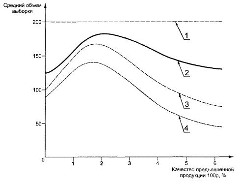 двухступенчатый контроль, 3 - многоступенчатый контроль Рисунок 4 - Сравнение кривых оперативных характеристик для планов одно-, двух- и многоступенчатого контроля (код объема выборки L, AQL = 0,65%) 2.24.2 Средний объем выборки В пунктах 2.18-2.22 описаны одно-, двух-, многоступенчатый и последовательный контроль. В целях сравнения удобно вычисление среднего объема выборки, необходимого на всей протяженности контроля с различным средним качеством продукции. В результате строят кривые среднего объема выборки, указывающие на относительную эффективность различных выборочных систем. Они отражают среднее число единиц для проверки до принятия решения о приемке или отклонения. На рисунке 5 приведены средние объемы выборок для группы эквивалентных одно-, двух-, многоступенчатых и последовательных выборочных планов из таблицы 2 с ОХ на рисунке 4. 1 - одноступенчатый контроль, 2 - двухступенчатый