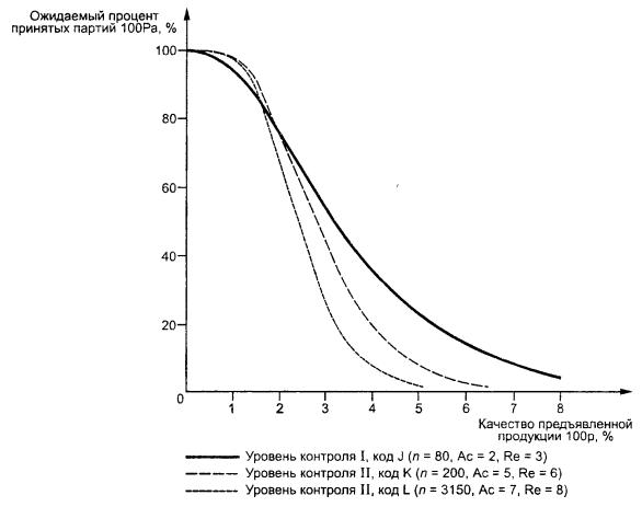 Число проконтролированных изделий составит 160 шт. в час. При объеме партии 1800 и объеме выборки 125 качество партий будет равно 0,5·(2,3% + 10%) = 6,15% несоответствующих изделий. На оперативной характеристике видно, что 50% партий будет принято и 50% отклонено. Число проконтролированных изделий составит 125 шт. в час. Больший объем партий требует меньшего объема контроля, однако и требует своей цены. Вместо 60% принимаемых партий со средним качеством несоответствующих изделий 3,6% принимают 50% партий, и это приведет к 6,15% несоответствующих изделий в принятых партиях. Низкая доля принимаемых партий приведет к тому, что изготовитель и контролер признают, что производство не дает требуемого качества, и необходимы действия по улучшению. Если оценка продукции на контроле изделий от каждого из двух станков проводилась отдельно, это облегчит поиск решения. Если продукция была смешана, проблема может быть не только в одном из двух станков. В этом примере для наглядности качество изготовленных деталей на двух станках в третьем случае (2,3% и 10% несоответствующих изделий) сильно различается. При более близком качестве принцип остался бы неизменным. На практике партия часто включает изделия из нескольких источников. Продукция может быть изготовлена с различными уровнями качества и долями изделий, включенных в партии от каждого источника, например детали, изготовленные на многопозиционных литейных формах, автоматическом многошпиндельном токарном станке или на нескольких аналогичных производственных линиях. Производство может быть организовано таким образом, что нелегко определить отдельные источники продукции без специальных мероприятий, которые могут быть связаны с затратами и неудобны. Кроме того, может потребоваться включать продукцию всех источников для того, чтобы получить партии требуемого объема. Включение в партию изделий ряда различных источников, где процесс изготовления происходит с различным уровнем качества и поэтому не строго однородный, не влияет на оперативную характеристику, однако может привести к отклонению хорошей продукции (поскольку она была смешана с плохой) или приемке плохой продукции (так как она была смешана с хорошей), в то время как при отдельном контроле хорошая партия могла пройти приемку, а плохая нет. Но если один или более источников имеет уровень качества значительно хуже, чем остальные, влияние незамедлительно проявится в доле приемки и будет необходимо провести анализ. Он должен выявить источник плохого качества. Если его нельзя исправить, он должен быть изолирован, и его продукцию следует контролировать отдельно. Уровень контроля определяет зависимость между объемом партии и объемом выборки. Таблицы спланированы таким образом, что при большом объеме партии объем выборки больше объема выборки для небольшой партии. Однако он становится более непропорционален. Из большой партии выборка составляет меньшую долю, чем из малой. В таблице I ГОСТ Р 50779.71 приведены три общих уровня контроля (I, II и III) и четыре специальных уровня (S-1, S-2, S-3 и S-4). Общие уровни контроля используют наиболее часто и оговаривают, что уровень контроля II будет использоваться всегда, когда не указан ни один из других уровней [10.1]. Уровню I соответствует объем выборки, который несколько меньше половины объема выборки на уровне контроля II, в т