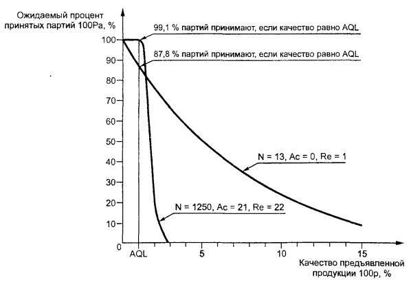 3.14 Методы снижения рисков, связанных с выборкой Выборочный контроль всегда связан с рисками как приемки продукции низкого качества, так и отклонения продукции высокого качества, но эти риски должны быть допустимыми при условии, что AQL и уровень контроля выбраны правильно. Если поставщик или потребитель считают, что в каком-либо конкретном случае их риск завышен, можно проверить правильность выбора AQL и уровня контроля. Предполагается, что они назначены верно. Изготовитель заинтересован в снижении риска в тех случаях, когда качество будет лучше AQL (он не может уменьшить риск другим способом). Потребителя риски будут особенно интересовать в тех случаях, когда качество будет хуже, так как если качество лучше AQL, он получает требуемое качество. Для снижения рисков каждой из сторон можно использовать три метода. Первый метод - улучшение производства. Может показаться, что этот путь очевиден, но при обсуждении выборочных планов, кривых ОХ, правил переключения и т.д. можно забыть об элементарном правиле, по которому при низком проценте несоответствующих единиц потребитель заведомо получает то, что ему требуется, а для изготовителя достигается высокая вероятность приемки. Второй метод применим только в частном случае при приемочном числе, равном 0. Планы с нулевым приемочным числом имеют такие пологие кривые ОХ, что большие риски неизбежны. По этой причине ГОСТ Р 50779.71 допускает применение альтернативного способа в тех случаях, когда таблицы ведут к нулевому приемочному числу (при одобрении уполномоченного органа). При этом используют планы для того же AQL, но с приемочным числом 1 вместо 0 [10.3]. Потребуется примерно вчетверо больший объем выборки по сравнению с тем, что требуется при нулевом приемочном числе. Но риски обеих сторон сильно снижаются, что зачастую оправдывает эти затраты. Затраты можно несколько сократить использованием двухступенчатого и многоступенчатого контроля (2.20 и 2.21). Эти альтернативы доступны, когда приемочное число равно 1 или более. Возможен последовательный контроль, но он не является предметом настоящего стандарта. Третий метод рассматривает возможность увеличения объема партии. Если объем партии увеличен достаточно, чтобы изменить код и увеличить объем выборки, это приведет к снижению рисков сторон, поскольку большему объему выборки соответствует более изогнутая кривая, и таблицы составлены так, что эта кривая будет выше прежней кривой для большинства точек с качеством лучше AQL и ниже в большинстве точек, где качество хуже AQL. Нельзя составить таблицы, сохранив эти свойства без потери других необходимых свойств. На рисунке 11 видно, что, например, четыре плана нормального контроля соответствуют AQL = 1,5%. Для качества лучше AQL видно, что чем больше выборка, тем выше доля принятых партий, в то время как для качества хуже AQL при максимальной выборке больше всего партий отклоняется, а при минимальной выборке отклоняется меньше всего (желательно, чтобы план максимально часто отклонял партии, когда качество хуже AQL). Рисунок 11 - Четыре одноступенчатых выборочных плана для AQL = 1,5% несоответствующих единиц при нормальном контроле Увеличение объемов партии для обеспечения лучшей защиты при контроле может обсуждаться, поскольку не всегда просто или разумно изменить объем партии. Он должен быть увязан с длительность