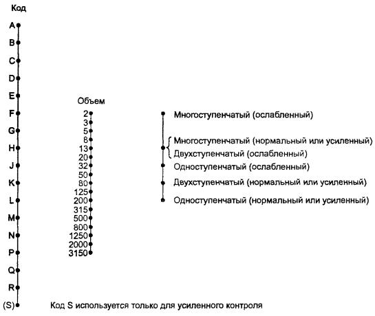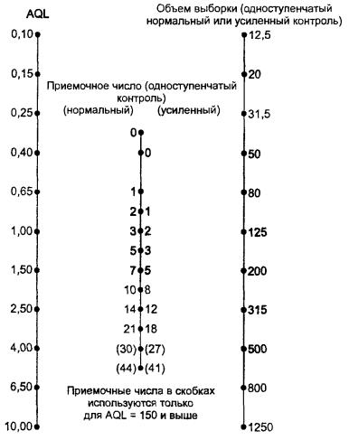 выборки должен быть округлен до ближайшего целого. Рисунок 13 - Номограмма для AQL, объема выборки и приемочного числа ГОСТ Р 50799.71 Объемы выборок для двух- и многоступенчатого контроля (по 2.20 и 2.21) строят по той же схеме, но для данного кода объем двухступенчатой выборки отступает на один шаг для серии, сравнимой с одноступенчатым контролем, в то время как многоступенчатый объем выборки отступает на два шага по сравнению с двухступенчатым. Объемы выборки для ослабленного контроля всегда отступают на два шага по сравнению с соответствующим нормальным планом. В итоге пять различных объемов выборки соответствуют любому данному коду объема выборки в зависимости от того, используется ли одноступенчатый, двухступенчатый, многоступенчатый план, и используется ли ослабленный контроль (по 3.15). Поэтому в качестве параметров таблиц использованы коды объемов выборки, а не сам объем выборки. 3.19
