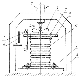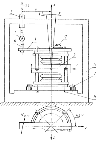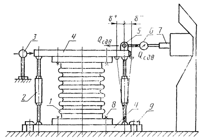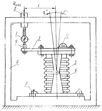 балка; 4 - оптический квадрант; 5 - компенсатор сильфонный; 6 - шарнир; 7 - прижим; 8 - стенд; 9 - серьга Черт.