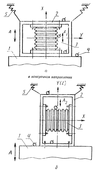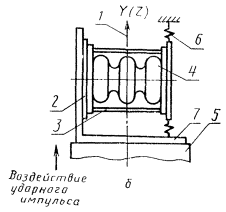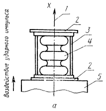 направлении 1 - стол вибропреобразователя; 2 - жесткая оснастка; 3 - компенсатор сильфонный; 4 - датчики-акселерометры; 5 - устройство статический разгрузки