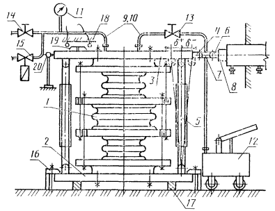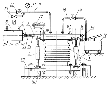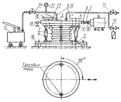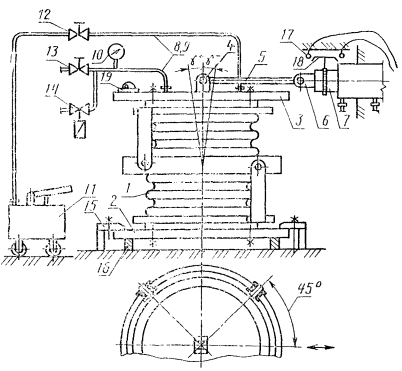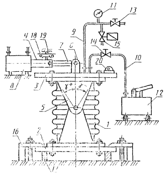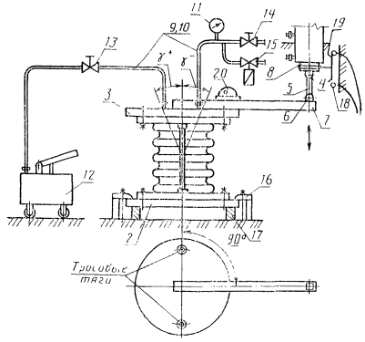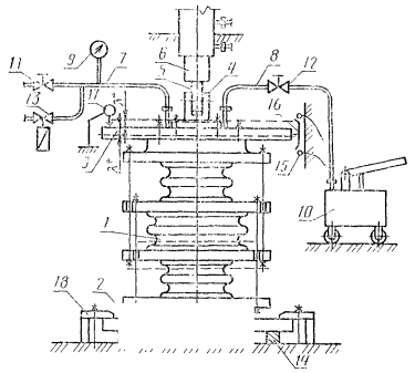 10 - шланг гибкий; 11 - манометр; 12 - насос; 13, 14 - клапан запорный; 15 - клапан предохранительный; 16 - прижим; 17 - выключатель конечный; 18