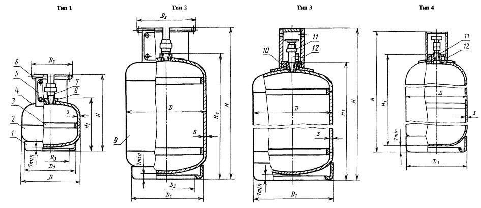 следующих типов: 1 - баллоны без обечайки с клапаном; 2 - баллоны с обечайкой и клапаном; 3 - баллоны с обечайкой и вентилем; 4 - баллоны без обечайки с вентилем; и исполнений: с воротником - В; с колпаком - К; с ручкой (ручками) - Р. (Измененная редакция, Изм. № 2). 1.2. Основные параметры и размеры